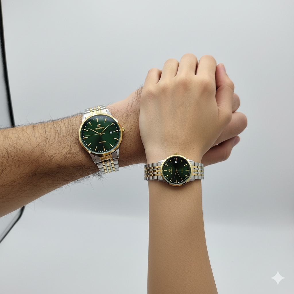 ساعت ست پرستیژ مدل P9204 LIMITED 500، نمادی از ظرافت و شکوه در طراحی است. این ست خاص با ترکیب جذاب صفحه سبز زمردی و بند دو رنگ طلایی و نقرهای از جنس استیل ضدحساسیت، جلوهای چشمنواز به استایل شما میبخشد.