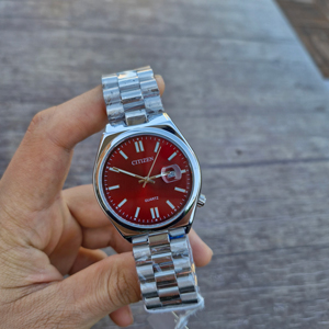 رنگ قرمز چری صفحه، نقطه قوت اصلی این ساعت ست سیتیزن است؛ رنگی جسور، شیک و خاص که به‌راحتی با استایل‌های فشن، نیمه‌رسمی و حتی رسمی مدرن ست می‌شود. بند استیل نقره‌ای در کنار صفحه قرمز، این ساعت ست را به انتخابی فوق‌العاده برای پوشش‌های تیره، مشکی، طوسی و حتی سفید تبدیل کرده است.