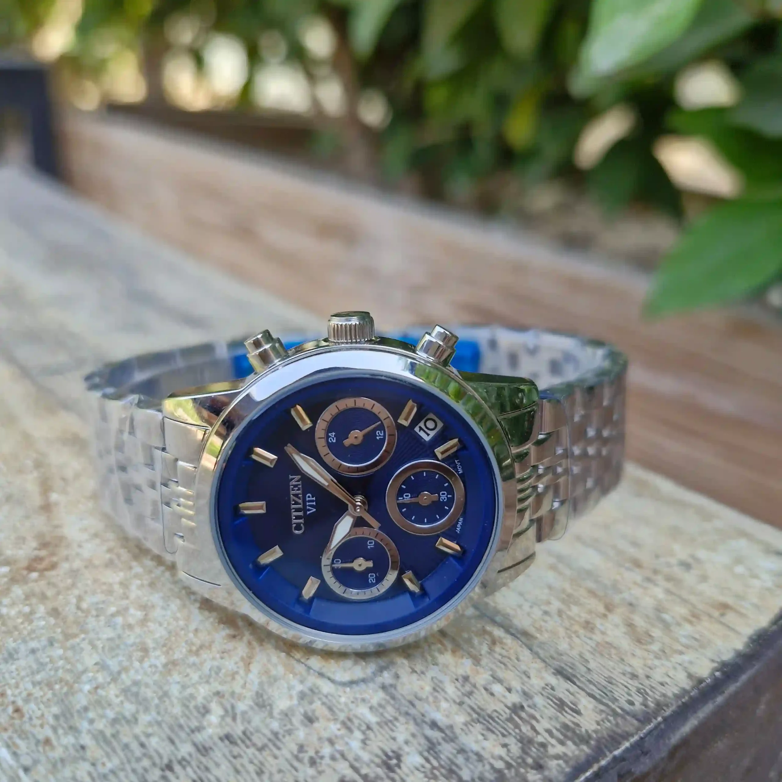 ساعت سیتیزن زنانه با طراحی الهامگرفته از مدلهای لوکس، صفحه سرمهای عمیق و بند استیل براق، جلوهای خاص و متفاوت روی مچ دست ایجاد میکند. ترکیب امکانات کاربردی مانند کرنوگراف، نمایش تاریخ و ساعت ۲۴ ساعته باعث شده این مدل علاوهبر زیبایی، عملکردی کامل برای استفاده روزمره و رسمی داشته باشد. قطر قاب ۳۵ میلیمتری نیز تعادل فوقالعادهای بین ظرافت زنانه و حضور قدرتمند ساعت ایجاد کرده است.