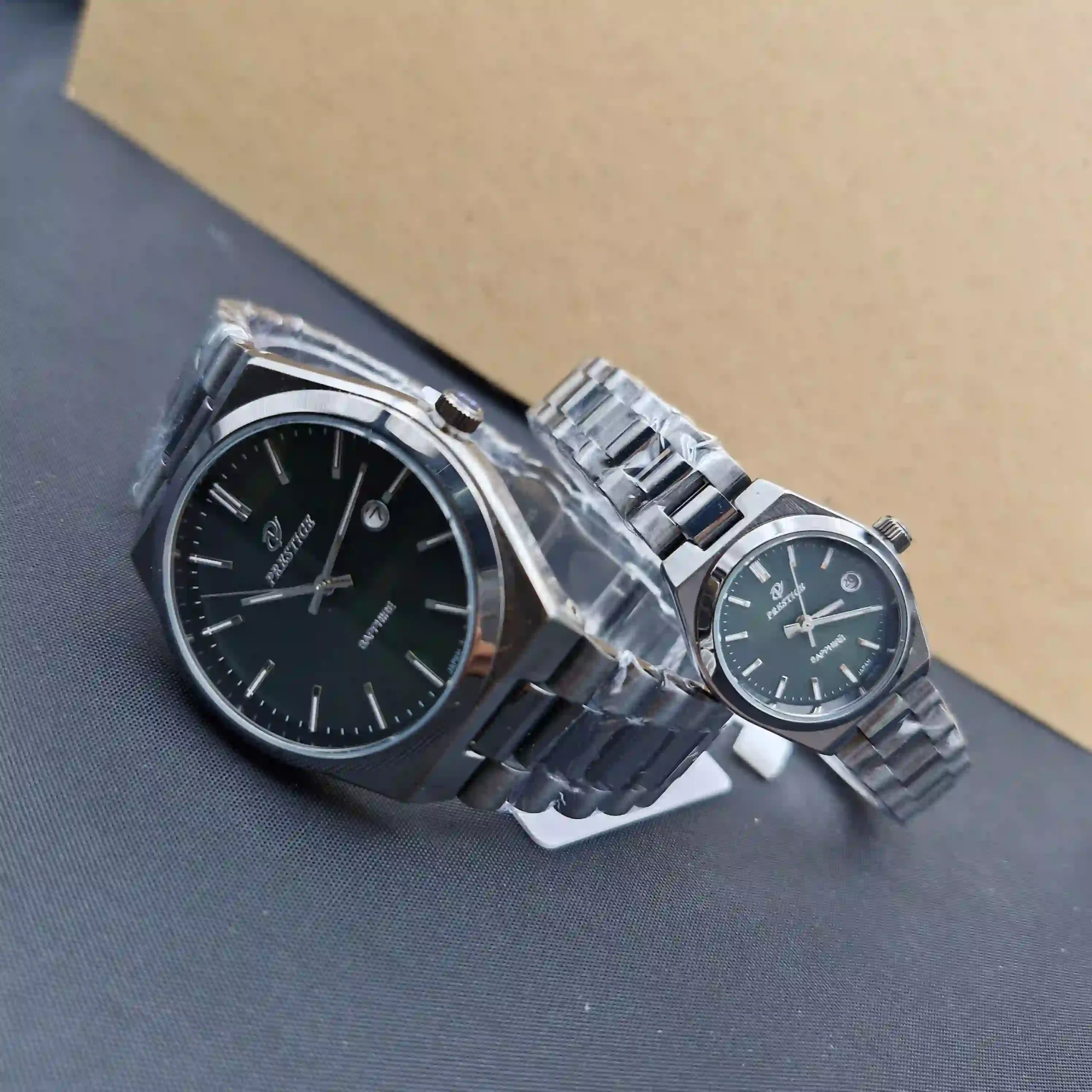 اگر به دنبال یک ساعت ست هستید که هم جذابیت ظاهری داشته باشد و هم کاربردی باشد، این مدل دقیقاً همان نیازی را برطرف میکند که اکثر زوجها دارند: هماهنگی در استایل، کیفیت بالا، و یک انتخاب ماندگار برای استفاده روزمره تا مراسم رسمی. این ست با صفحه سبز جذاب و بند استیل دودی، ترکیبی کمیاب و بسیار لوکس ارائه میدهد که در نگاه اول نظر هر کسی را به خود جلب میکند.