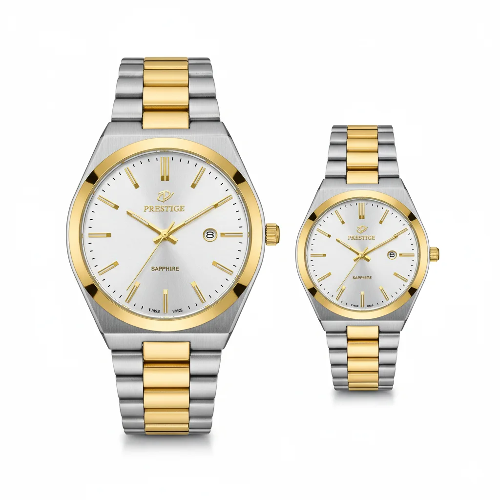 اگر به دنبال یک ست ساعت هستید که هم کیفیت بالا داشته باشد و هم ظاهر لوکس و رسمی شما را تکمیل کند، این مدل دقیقاً همان نیازی را برطرف میکند که اکثر زوجها به دنبال آن هستند: هماهنگی کامل در استایل، طراحی شیک و همیشگی، و ساختار مقاوم برای استفاده روزمره و مهمانیهای رسمی. صفحه سفید نقرهایِ ساده و تمیز در کنار بند استیل دورنگ طلایی، ترکیبی کلاسیک و جذاب ایجاد کرده که هیچگاه از مد نمیافتد.
